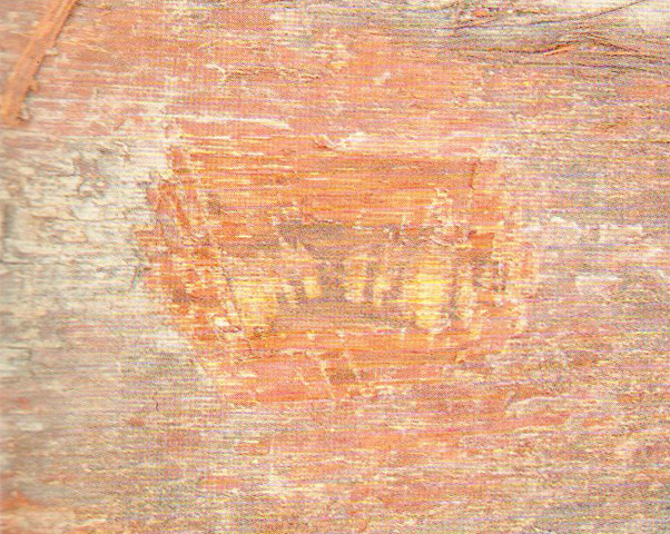 ●識別要點:樹皮極薄。軸向薄壁組織短翼狀、聚翼狀、環(huán)管束狀及不規(guī)則弦向帶狀。管孔內(nèi)侵填體豐富。生材有檸檬味;木材有油性感。材質(zhì)重硬。本屬另一種為馬氏鐵樟木E.malagangai,較坤甸鐵樟木徑級小,材色紅,質(zhì)輕,有較長的翼狀薄壁組織。