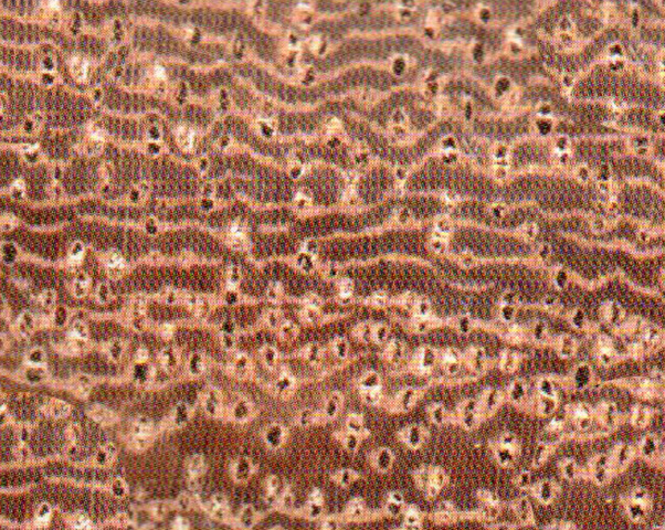 心邊材區(qū)時(shí)段明顯,心材暗紅褐色,具黑色同心圓狀細(xì)條紋,邊材粉紅褐色或淺黃白色、較寬,5-8cm。生長(zhǎng)輪明顯。