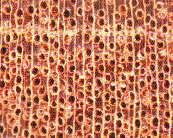 散禮材。管孔肉眼下明顯,略多,大小中等;單管孔;部分斜列;侵填體豐富,軸向蒲壁組織放大鏡下可見,環(huán)管束狀或近翼狀。本射線肉眼下略見。略密,略寬。軸向樹膠道內(nèi)眼下明顯,長弦列白色點狀。